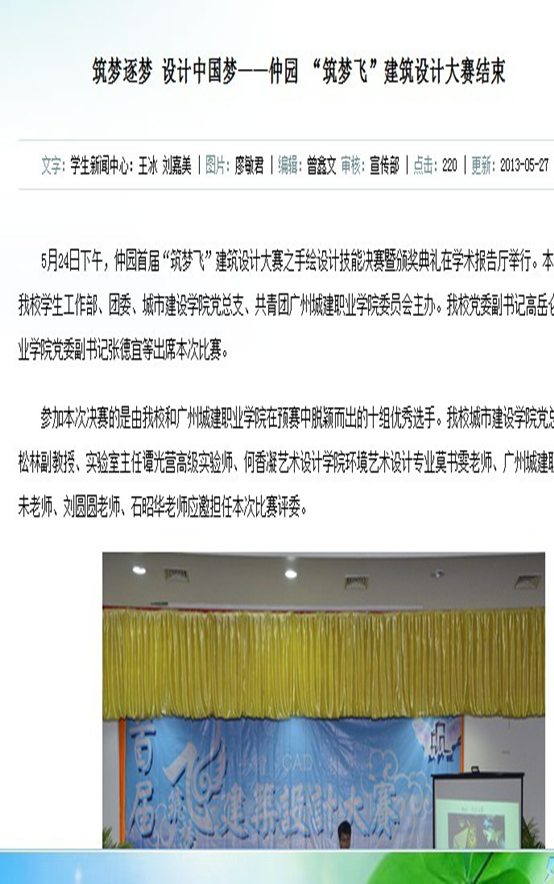 建筑是城市的名片,是时代的象征。为积极响应党中央提出实现“中国梦”的号召, 仲恺农业工程学院与广州城建职业学院以“中国梦·建筑梦”为主题联合举办题为“筑梦飞”的建筑设计大赛,旨在将“中国梦”融入建筑设计的各方面和全过程,努力建设美丽中国,勾画中国建筑未来发展的美好蓝图。同时,筑梦飞、助梦飞、逐梦飞,通过本次活动,引导和鼓励大学生树立梦想,让青春在追逐梦想中焕发光彩、在学习和实践中绽放活力,同心共筑“中国梦”。以此营造积极向上的校园文化氛围、打造专业特色与时代精神紧密相融的校园文化,并通过与外校合作,促进校园文化的对外交流,丰富校园文化的内涵,促进校园文化建设新思路的探究。