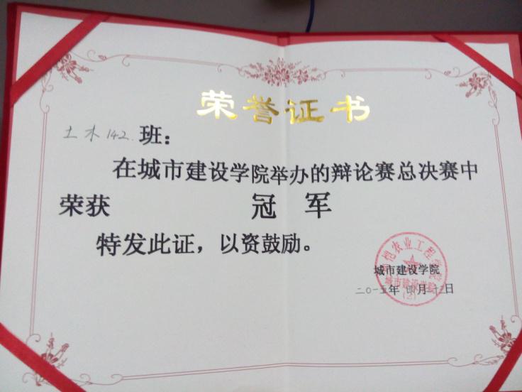 在去年的新生辩论赛中,我们班的辩手认真的钻研、思考辩题、讨论,凭借着非凡的实力,获得了学院的第一名