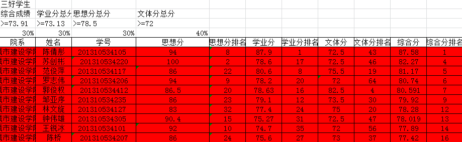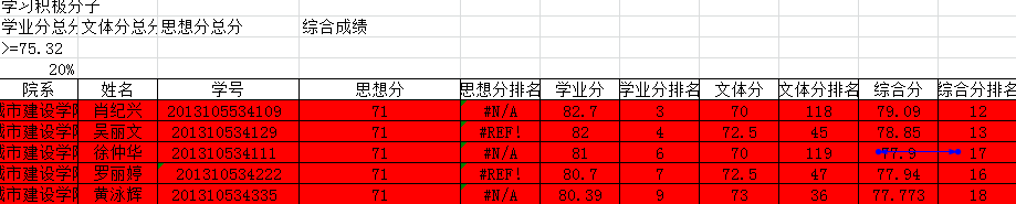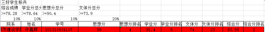 在大二学年中,本班的学习委员范俊萍同学每天每节课都对班里的考勤情况进行记录,并整理后将相关资料上交学院学术部。考勤结果在综合测评和推优入党工作中有优异表现,三位同学进入综合测评前十名,分别占据第1、2、6名。其中更有获得三好学生标兵一名,三好学生4名,积极学习份子3名,获得“优秀共青团员称号2名。