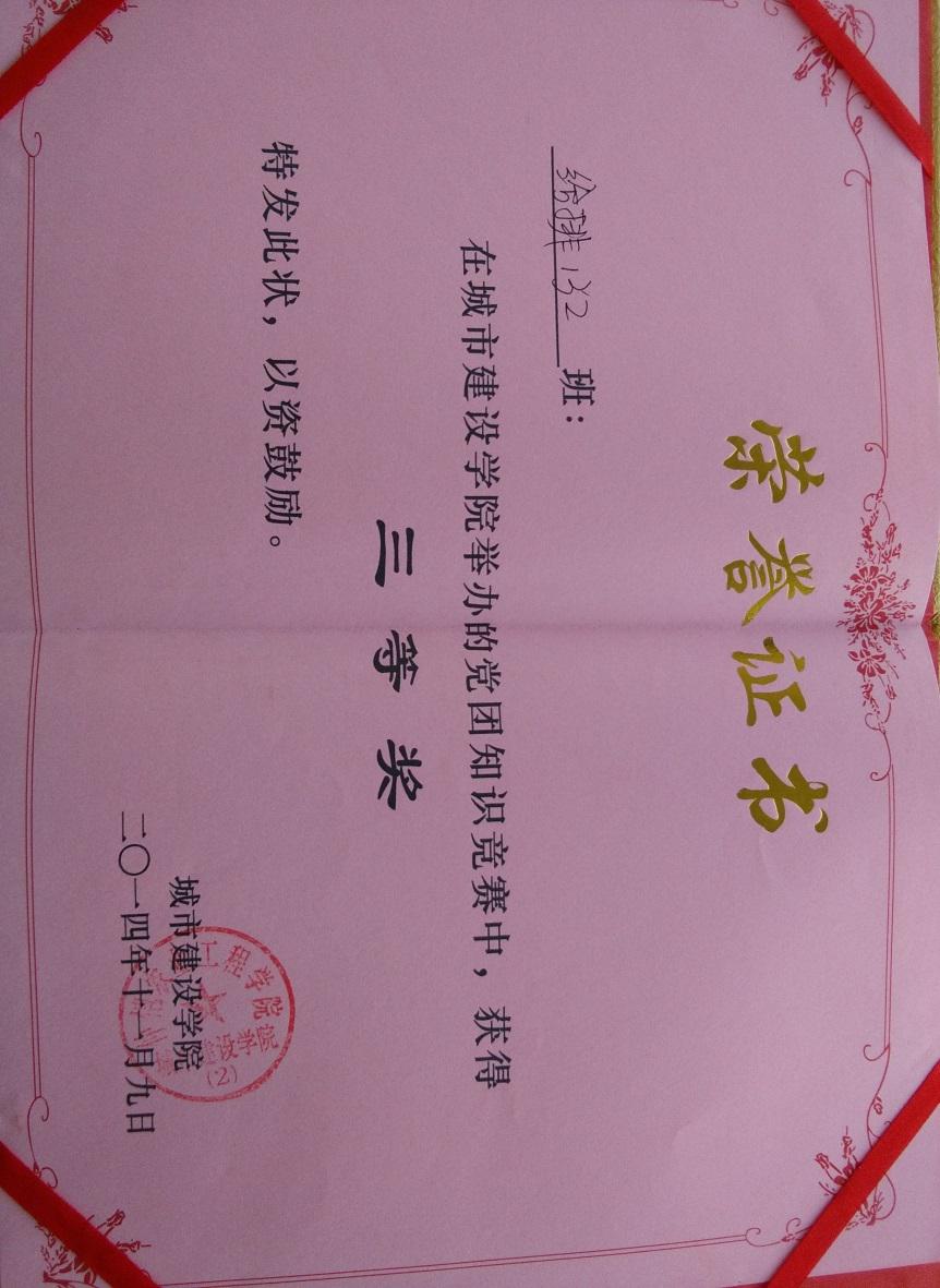 在大二上学期举办的党团知识竞赛中,我们班选去的队员凭借着出色的表现,使我们班在本次的活动当中取得了党团知识竞赛三等奖的好成绩,在初赛的时候,学习委员李东铖带领着陆志威等同学凭借着出色的发挥,为我们班顺利赢得了一张进入决赛的门票,进入决赛后,陈伟文同学以给排水132的队长的身份,领导其他三名队员拍宣传视频,做决赛答辩的准备,班长和团支书则安排好了党团知识竞赛当日的表演,付出这些努力,我们班最终在党团知识竞赛中获得了三等奖的好成绩。