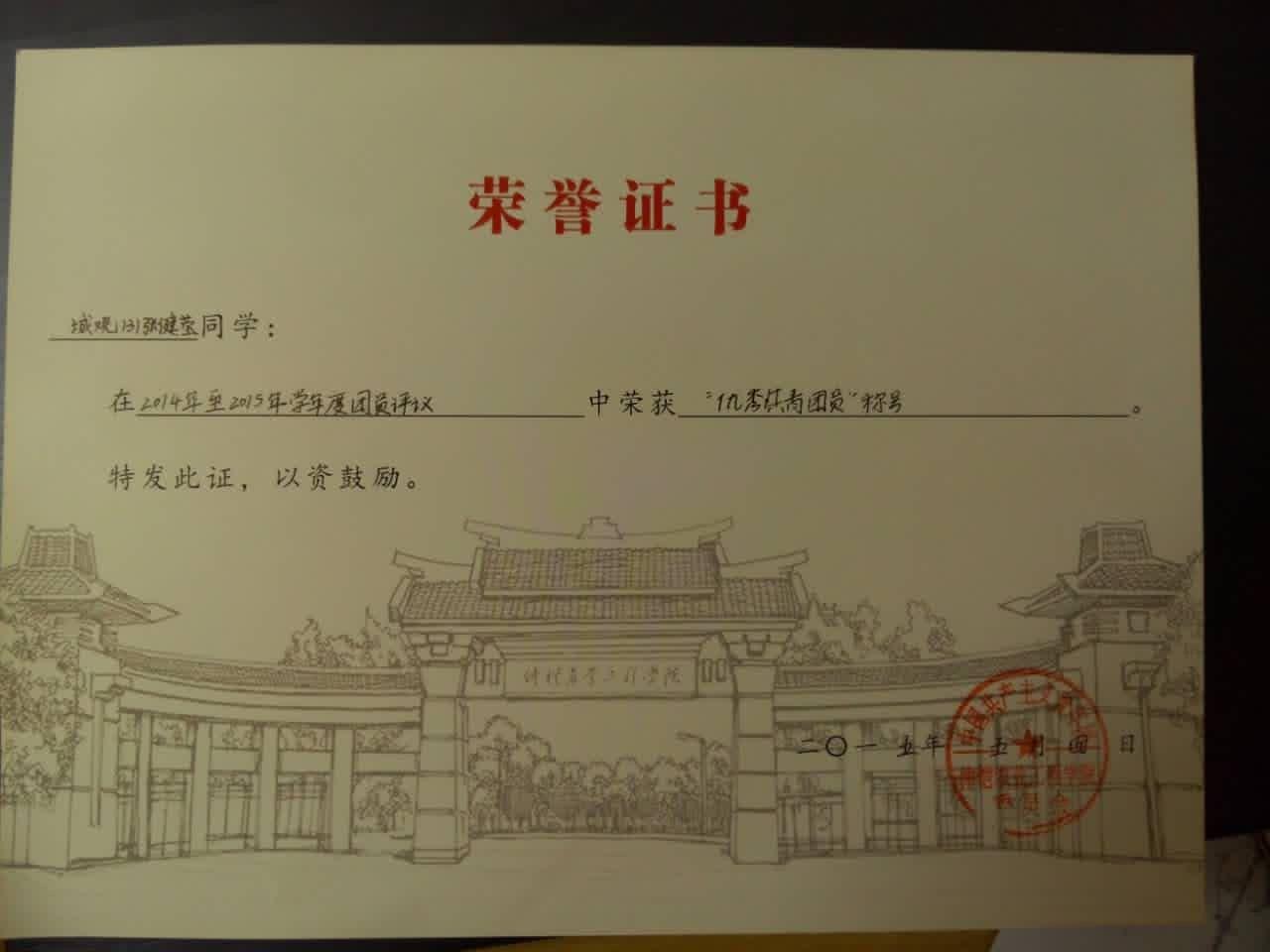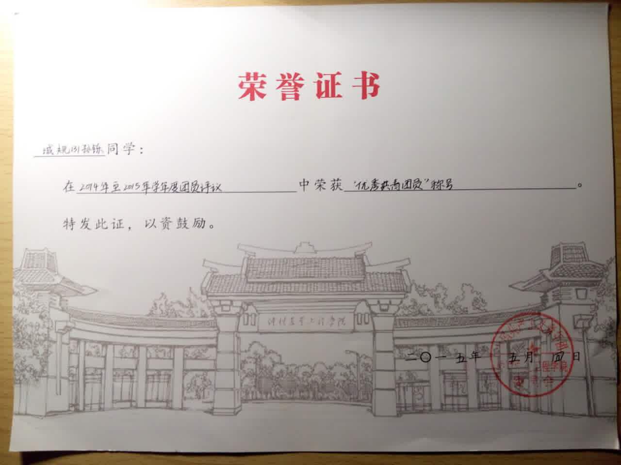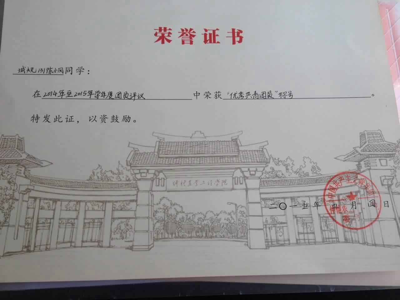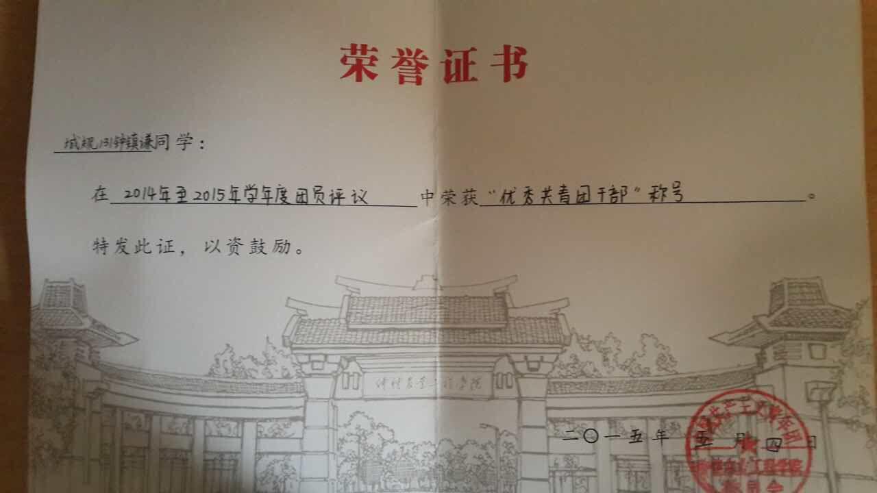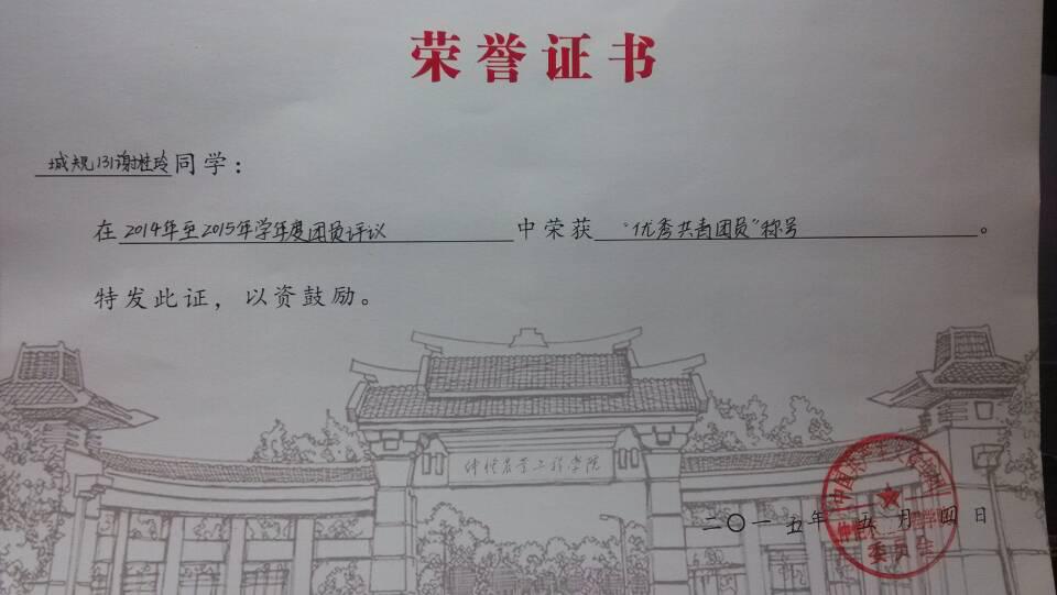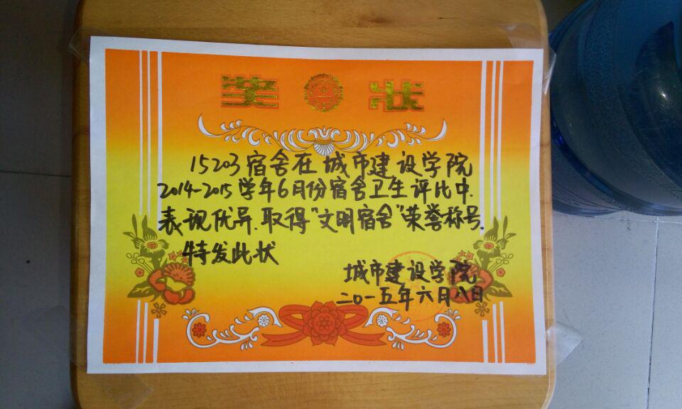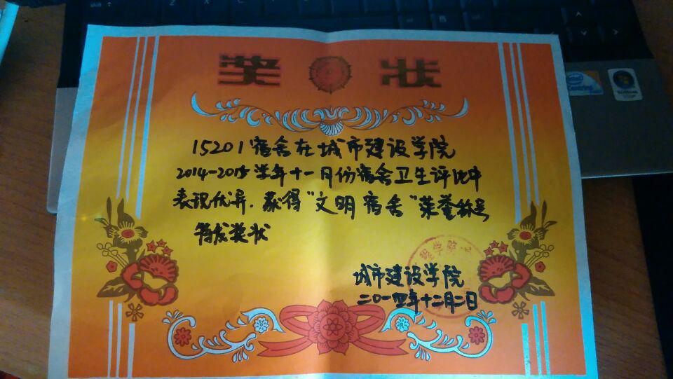 15202宿舍在城市建设学院2014~2015年度 11月份宿舍卫生文明评比活动中获得“文明宿舍”称号。