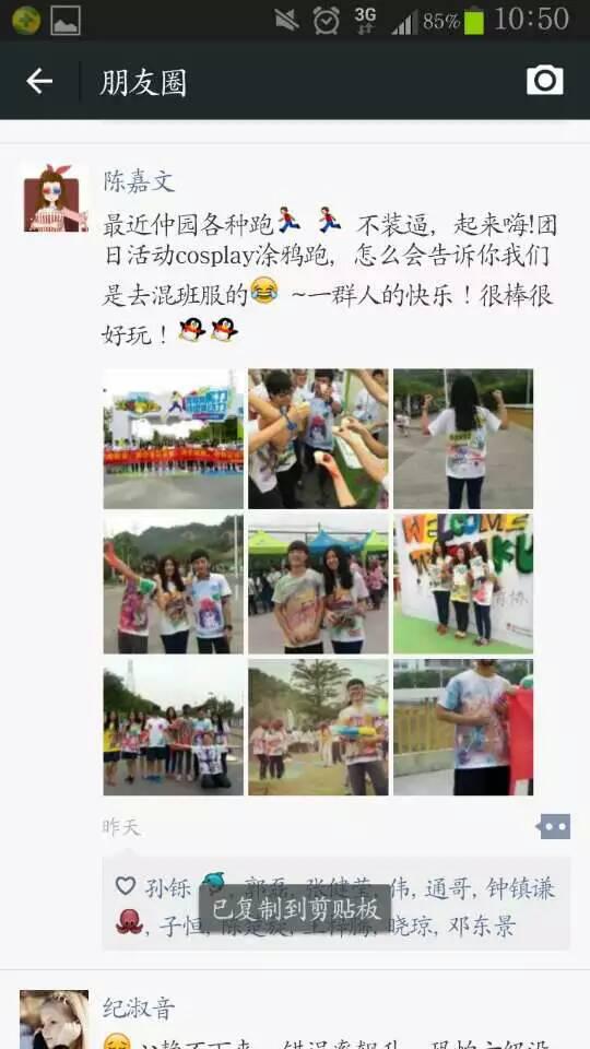 成果:城规131团支部本次团日活动主题是“走出宿舍,我的多彩青春;携手城规, 你的花样年华”。前期宣传从团支部自身开始,进而面向全院、学校宣传,形式是通过拉横幅,团支部成员集体参与由校青协主办的环校“涂鸦跑”向全校宣传本次团日活动。其次,城规131团支部积极利用网络,在班级微博,微信朋友圈宣传团日活动,支部成员激情参与,宣传引起学校同学广泛关注,达到预期效果,这也呼应了团日活动“进社团,进网络”的主题。
