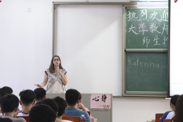 5月29日,英国爱丁堡龙比亚大学教师Katerina和Aamir Khokhar在为明胜m88官网学生授课。