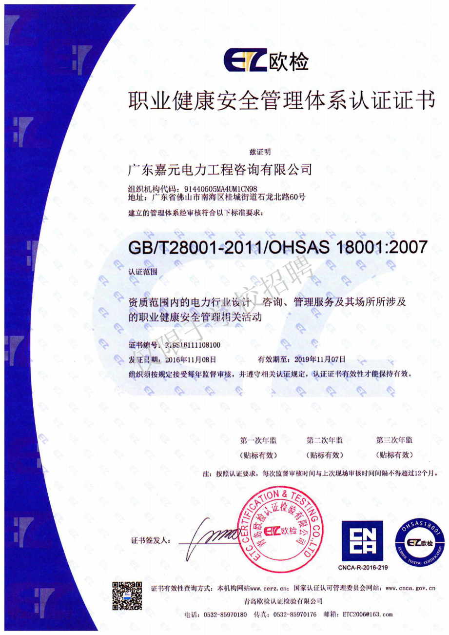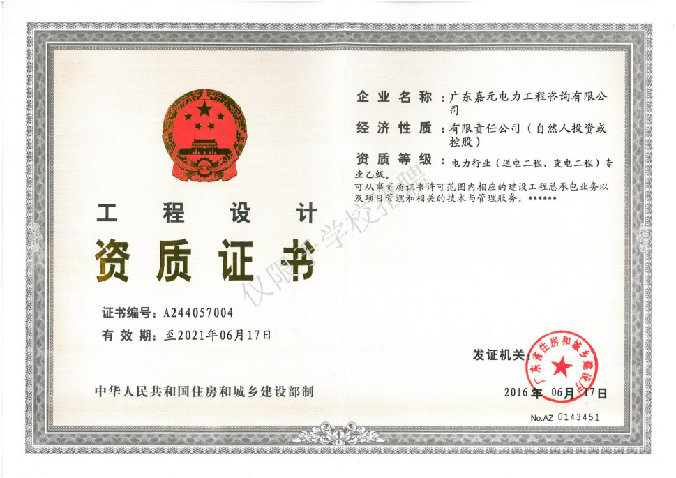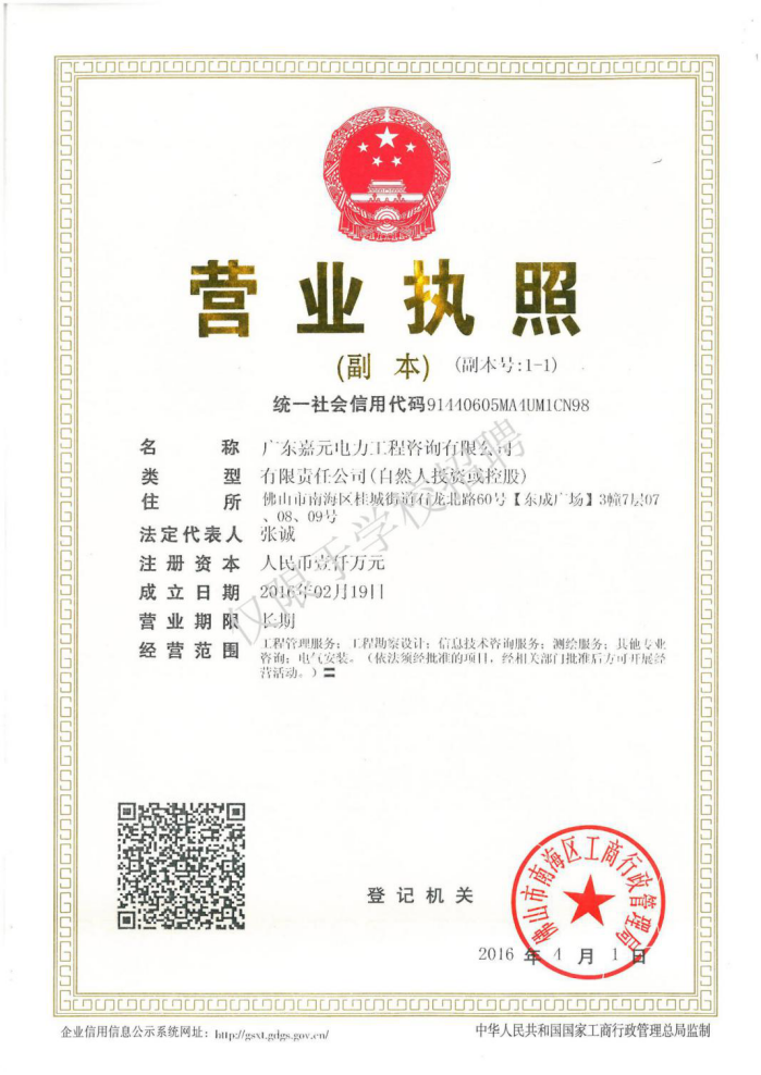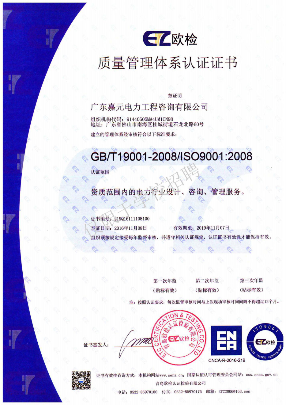 广东嘉元电力工程咨询有限公司成立于2016年2月,注册资本为人民币1000万元,注册地址为广东省佛山市南海区,是一家拥有独立法人资格的有限责任公司,设置有综合部、造价部、项目管理部、电气部、配网部、线路部、网信部等7个部门;公司经营范围包括:工程管理服务、工程勘察设计、信息技术咨询服务、其他专业咨询及电气安装等。我司已获得电力行业(送电工程、变电工程)专业乙级的资质,并且成为华南理工大学广州学院的实习基地。同时公司已通过ISO质量管理体系认证、环境体系认证、职业健康安全体系认证等。