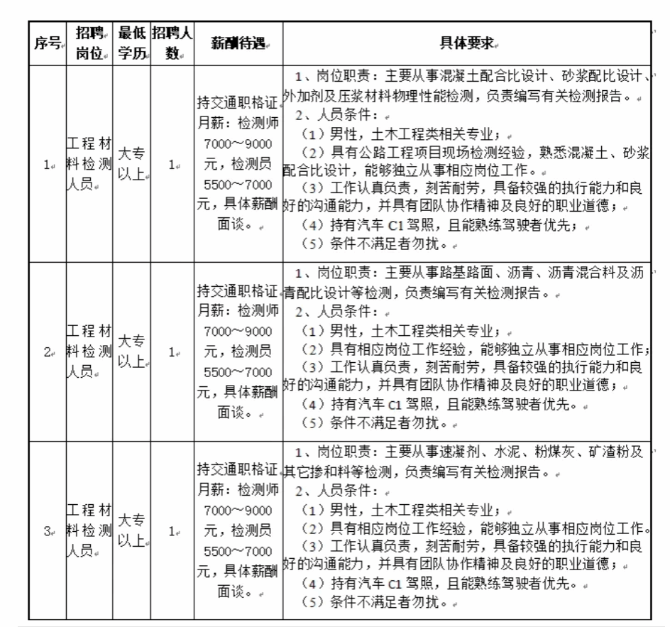 广东交粤工程检测有限公司招聘为第三方检测机构,公司具有CMA计量认证证书、公路工程桥隧专项、公路工程乙级、建设工程质量检测机构资质证书。业务范围有:桥梁隧道工程,地基工程,工程材料、路基路面、交通安全设施及路况调查等检测。因业务发展需要,现拟招聘以下人员: