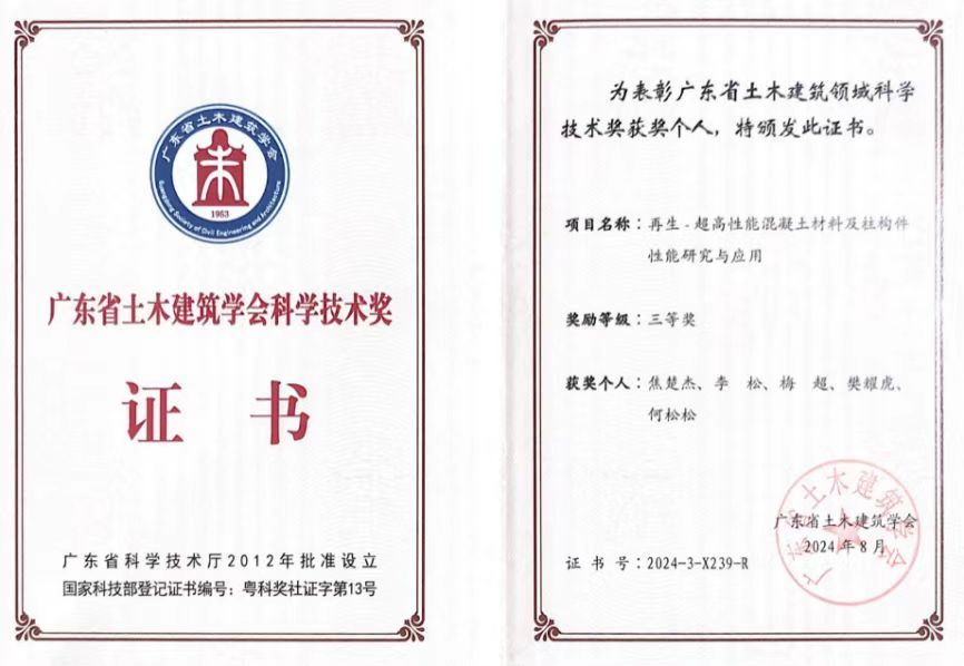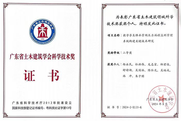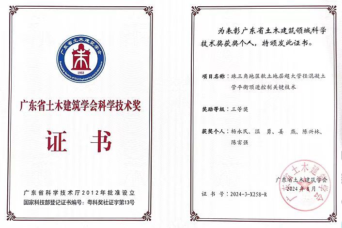 近期,广东省土木建筑学会公布了2024年科学技术奖获奖项目,明胜m88官网杨永民教授牵头的科技成果“数字孪生供水管网压力漏损监测管理系统构建关键技术研究”及“珠三角地区软土地层超大管径混凝土管平衡顶进控制关键技术”分别获得2024年广东省土木建筑学会科学技术奖二等奖、三等奖(明胜m88官网均为第一完成单位);此外,杨永民教授参与的科技成果“智能工艺循环冷却水成套装备研发及高效安装关键技术研究”以及李松老师参与的科技成果“再生-超高性能混凝土材料及柱构件性能研究与应用”分别获得2024年广东省土木建筑学会科学技术奖二等奖、三等奖(明胜m88官网分别为第三、第二完成单位)。
