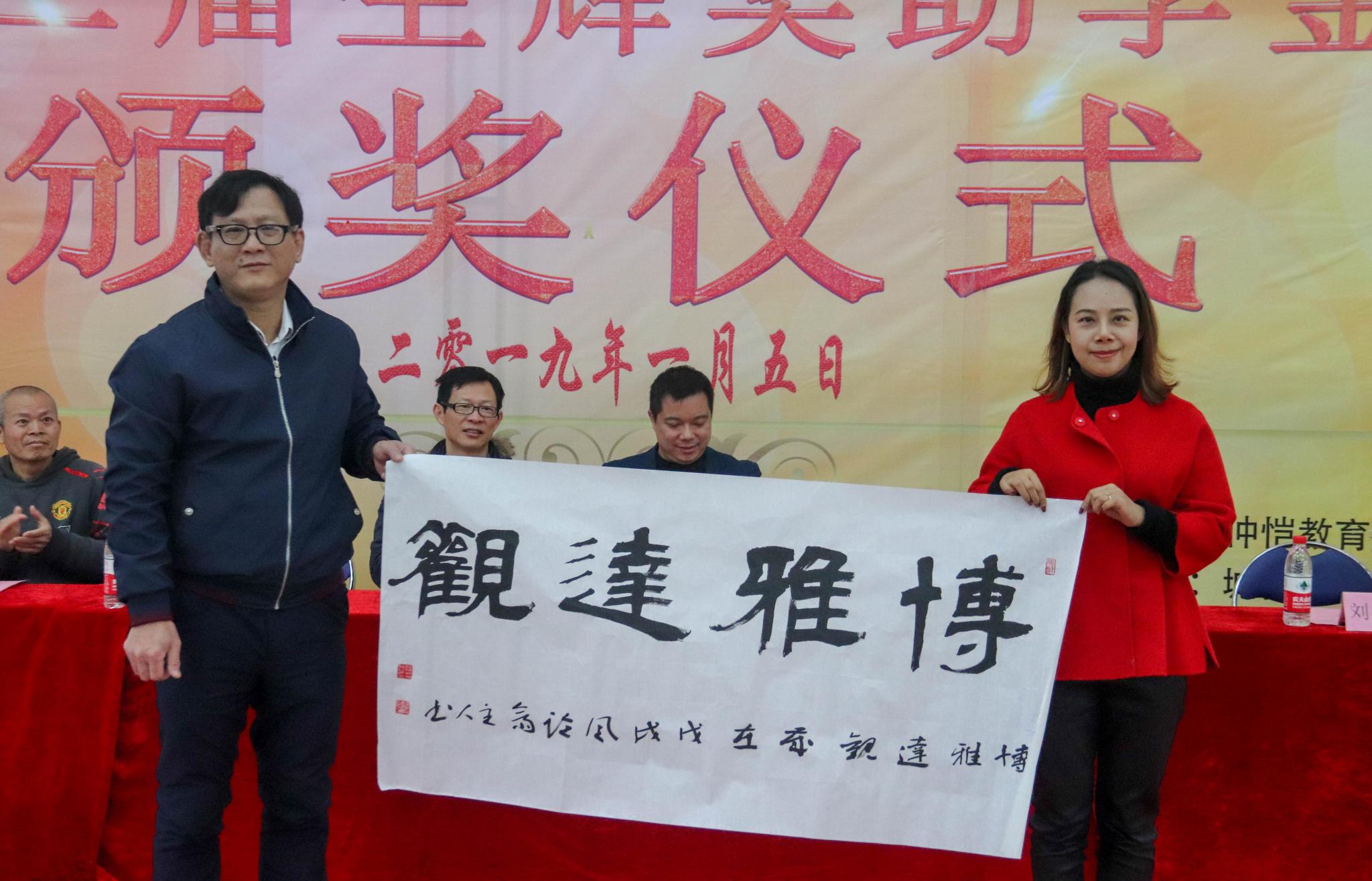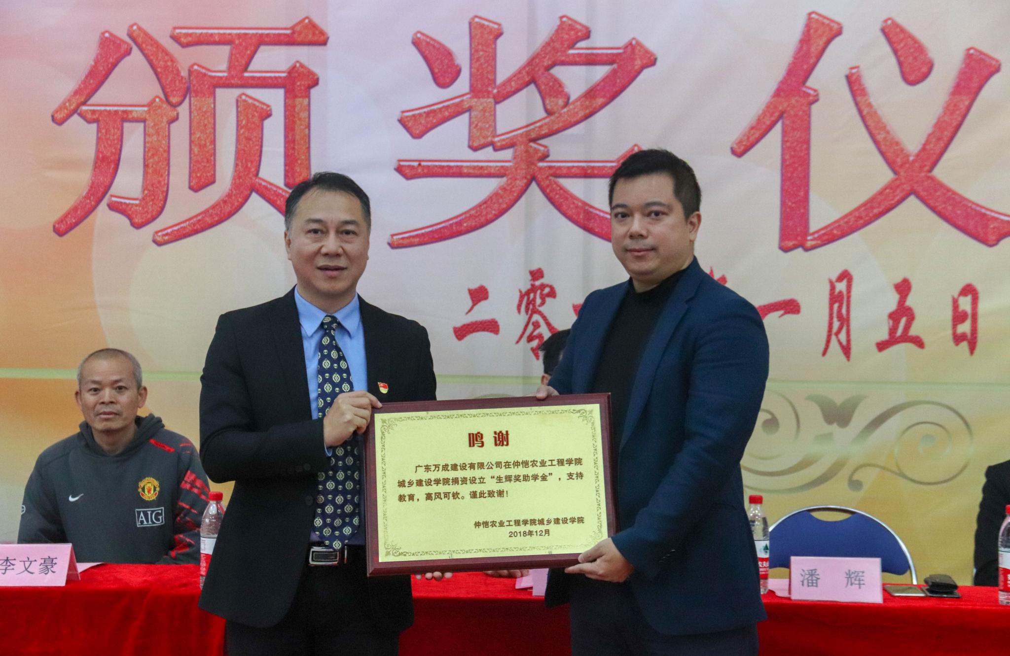 在同学们的热烈掌声中,由仲恺教育基金会秘书长李文豪向公司代表颁发捐赠证书,由该党支部书记韦松林向公司颁发鸣谢牌匾。此后,其他企业代表为学院捐赠出书画作品。