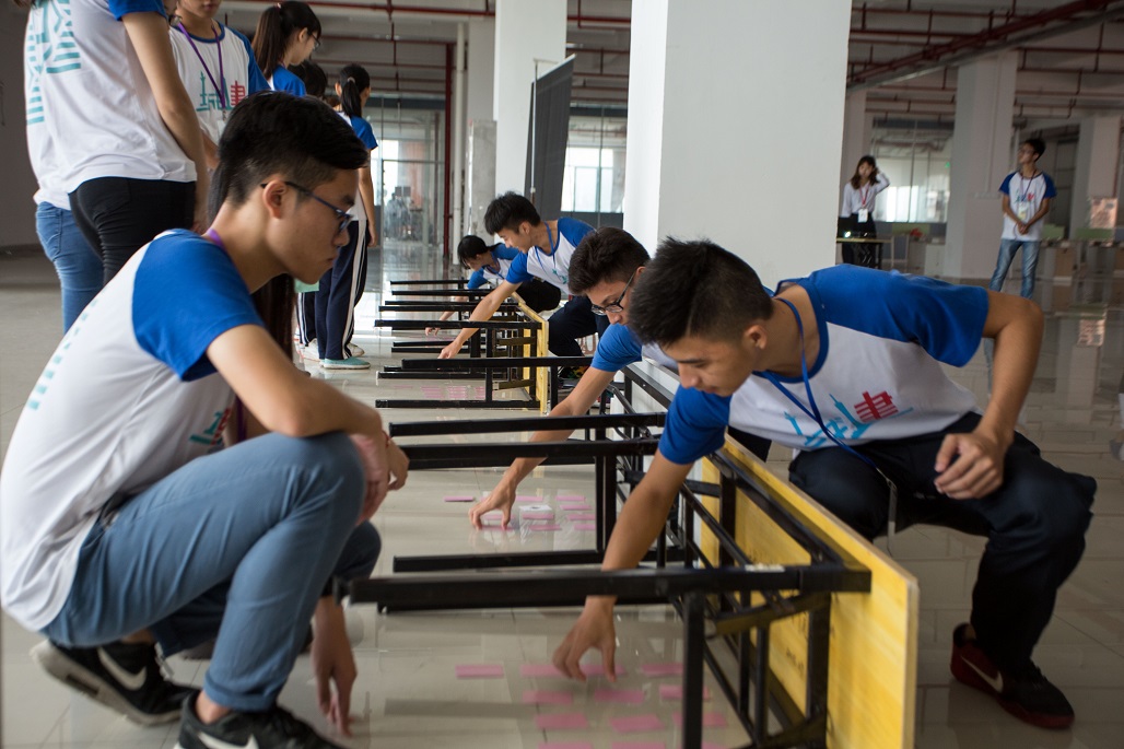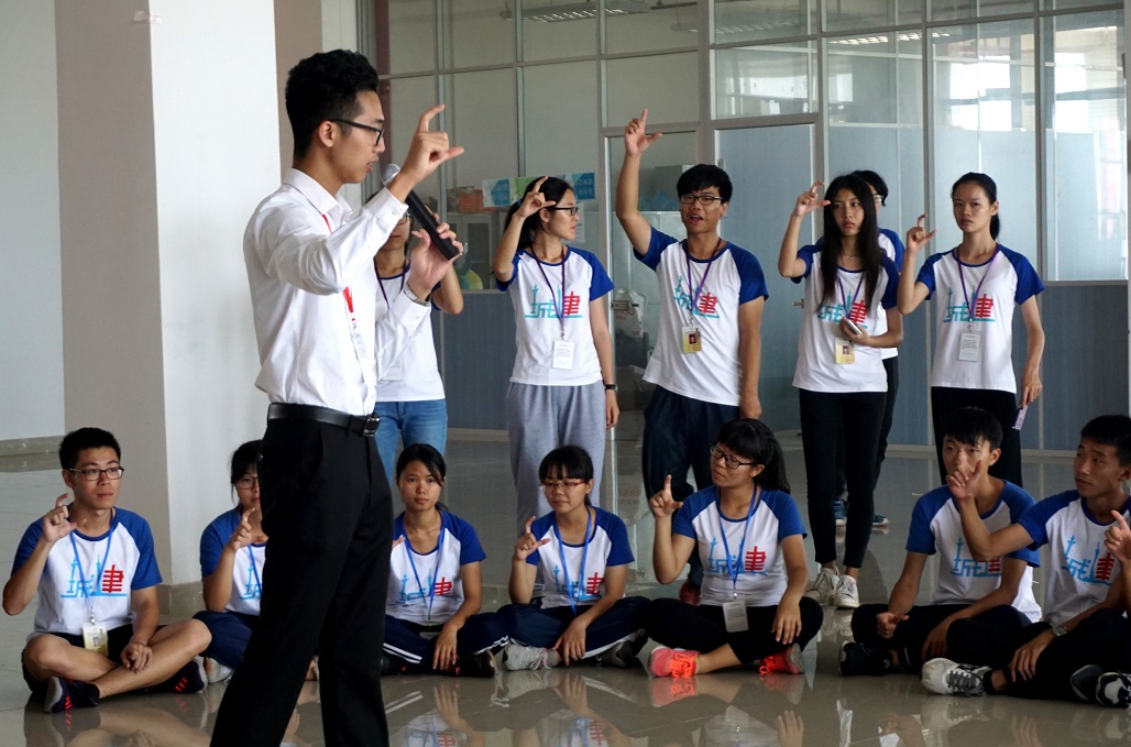 助理培训在学生活动中心进行。全体学生干部以小组为单位进行4个培训项目,每个项目均以场景形式融入相应道理,在书记主席团的带领下,在同学们的体验、分享、交流、整合过程中达到“有效执行、学会沟通、责任担当、团结协作”的目的。