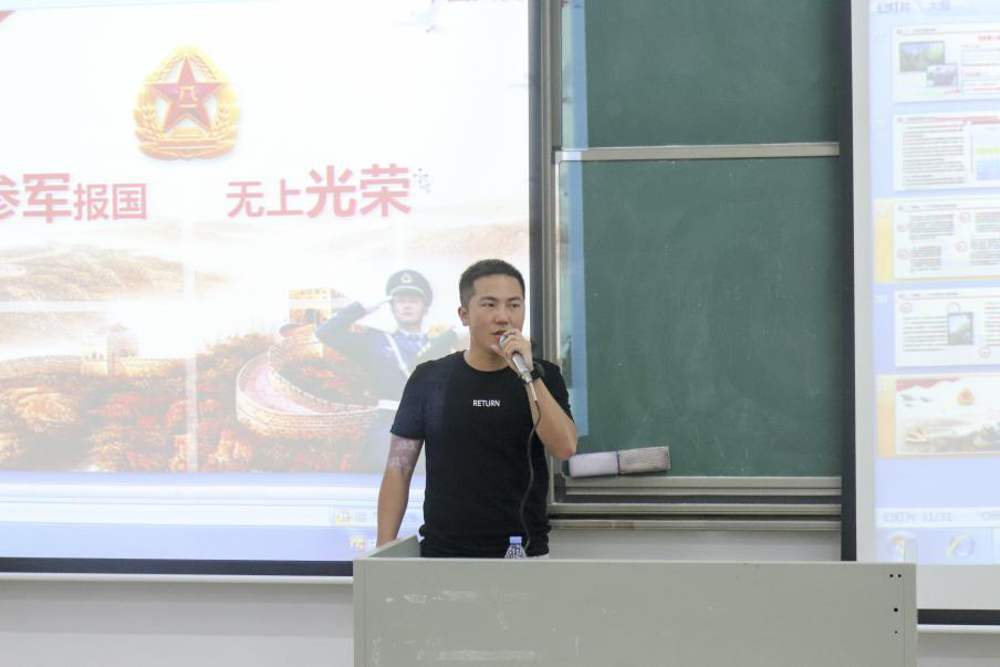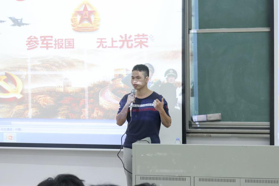 接下来,梁逸伦、刘敏聪、向瀚杰三位退伍军人依次向同学们讲述了他们各自在部队的训练、学习、生活情况,分享了他们的收获与成长的喜悦。梁逸伦同学谈到现代国防对文化素养高的大学生的需求,还谈到了当兵对他自身修养的提升,锻炼了他吃苦耐劳的精神。他说,“当兵后悔两年,不当兵后悔一辈子”;刘敏聪同学提到了他当兵时的生活作息与自身的兵梦。带着梦想而进,当兵光荣无上;向瀚杰则谈到了自己的军旅生活,不是枯燥无味的,而是丰富多彩,既磨练自己的意志,又锻炼了体魄,自己的身上已深深的打上了军人的烙印。
