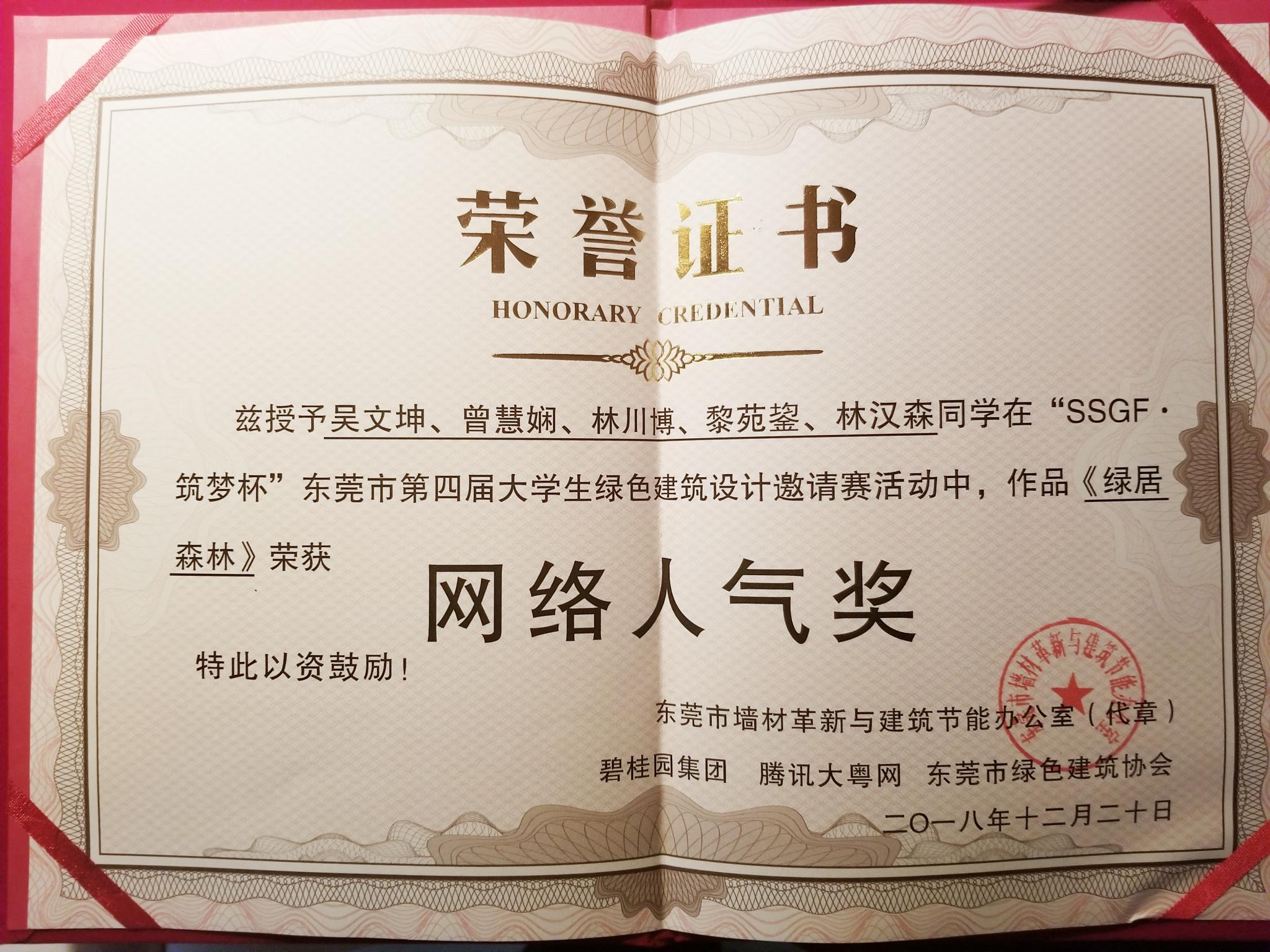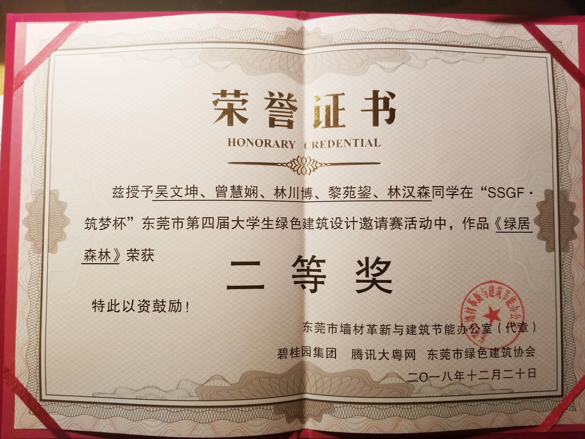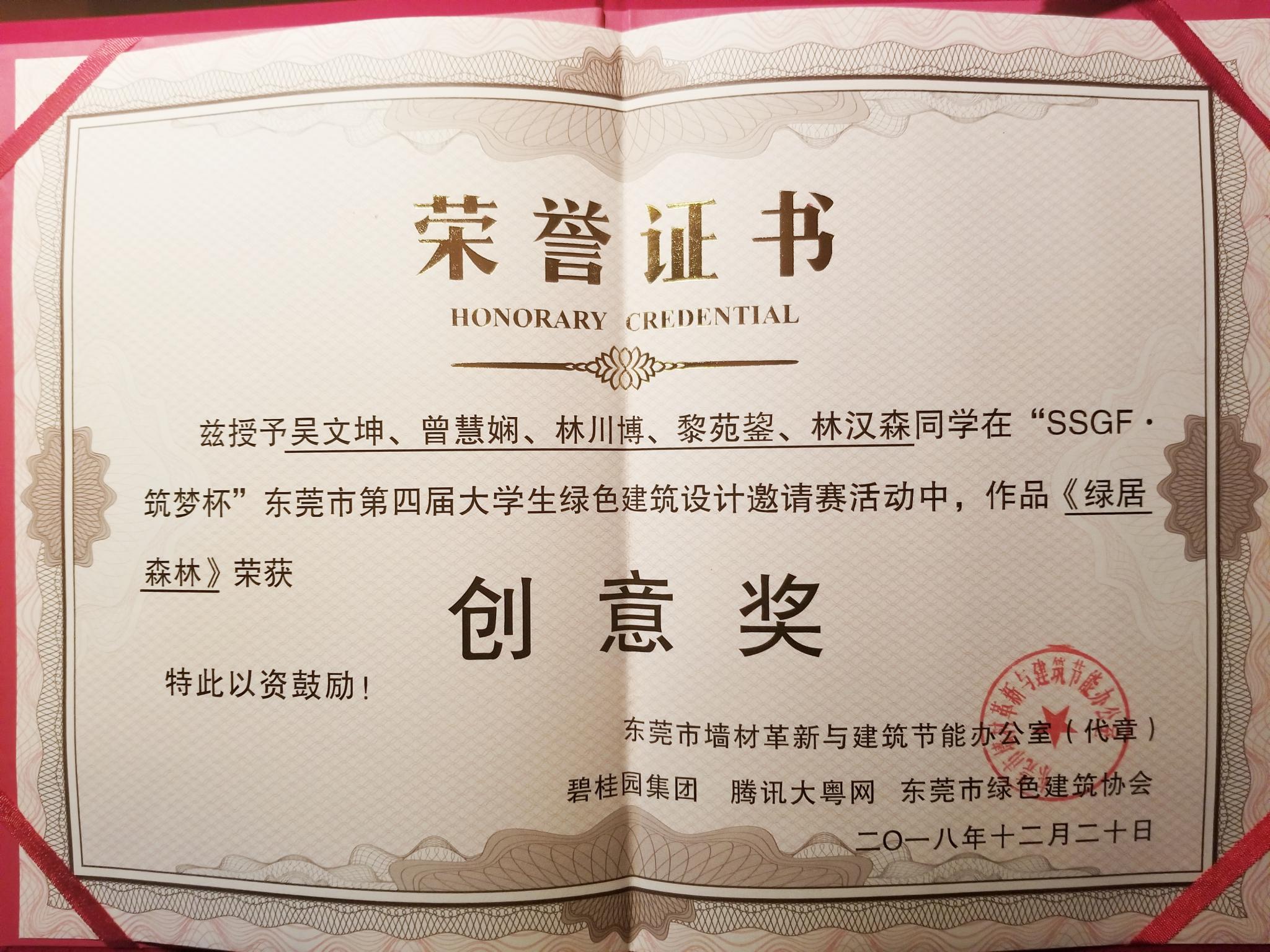 12月20日,东莞市墙材革新与建筑节能办公室、碧桂园集团、东莞市绿色建筑协会联合举办的第四届“SSGF·筑梦杯”大学生绿色建筑设计大赛颁奖活动在东莞市建筑培训中心举行。明胜m88官网明胜m88官网获奖团队在老师的带领下参加了本次颁奖活动。