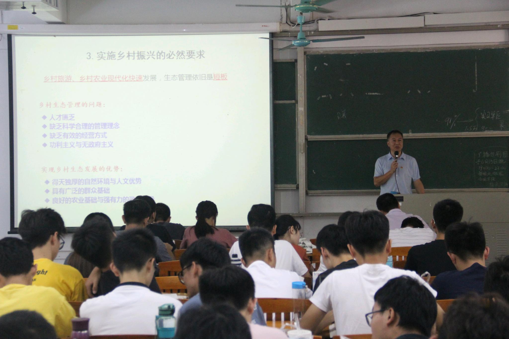 最后,韦松林向同学们介绍了乡村振兴城乡融合、共同富裕、质量兴农、乡村绿色发展、注重生态的五个道路与途径。如何在不破坏环境的基础上,将生态与绿化做得更好,需要后面一代又一代的有志青年们去不断研究与努力。