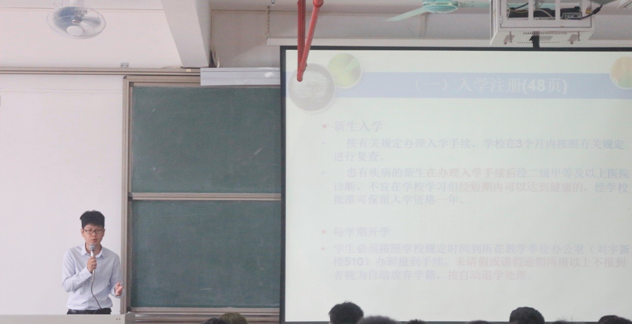 在《学生手册》的学习环节中,刘小海副书记给新生们进行了大学生安全教育,强化新同学们的安全意识。他在讲座中,强调了宿舍用电安全,并以活生生的网络诈骗案例警示大家谨防诈骗、远离网络高利贷。同时,他特别强调同学们一定要规范网络文明行为,禁止传播负能量,要求新生以仲恺为荣,爱校荣校。龚妃良老师进行了管理制度教育,希望同学们在校遵守学校规章制度,还鼓励同学们养成良好的行为习惯。冯中心老师给新生们进行了学籍学位教育,从入学注册、人才培养方案、教务网络管理系统的使用等十个方面为同学们一一讲解,提醒同学们注意学籍学位相关问题。张小翠老师对同学们进行了心理健康教育,提醒同学们注重自身心理健康,关注和关心身边的同学,及时发现和解决相关心理问题。周映萍老师给同学们进行了职业生涯规划的讲解,指引同学们对大学四年生活进行合理规划想象,学会做人做事,有目标有计划地度过大学生活。