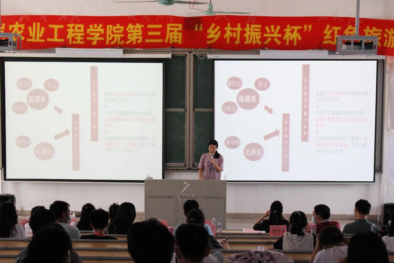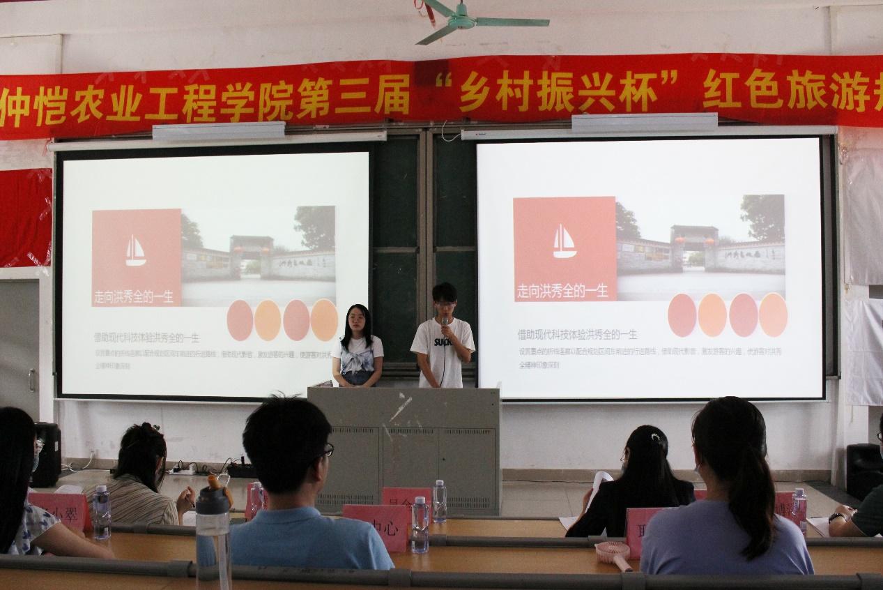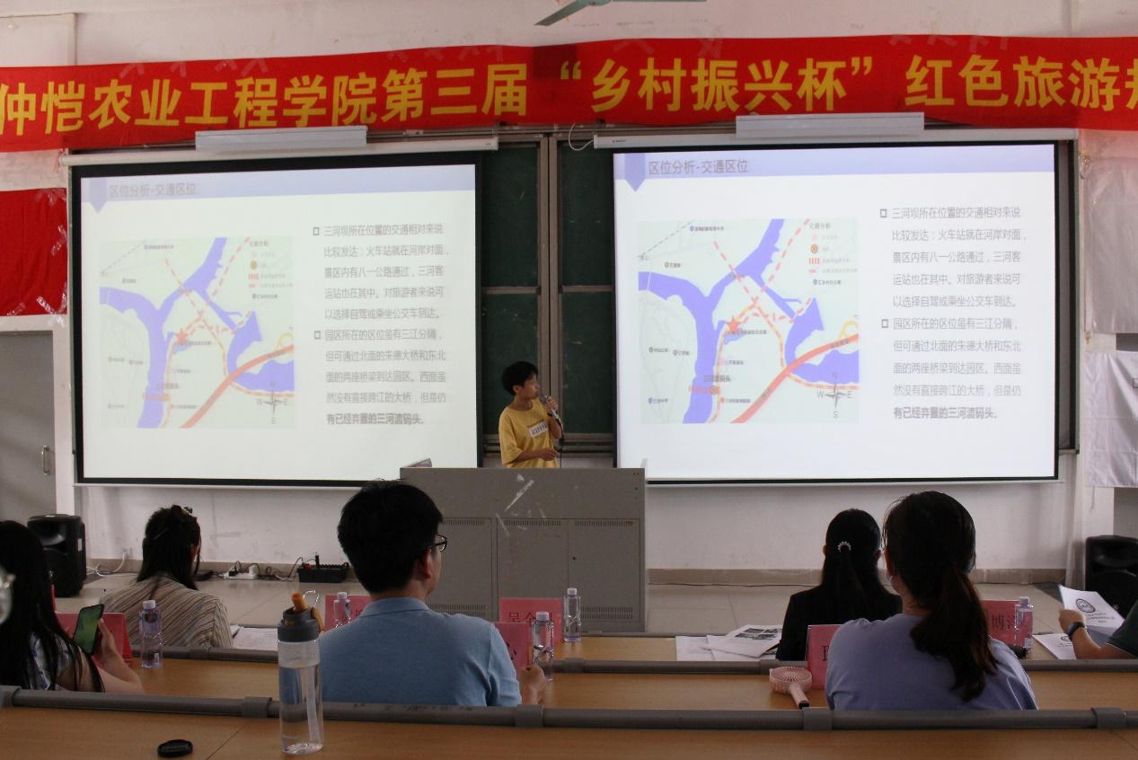 本次红色旅游规划大赛的赛题内容是选择一处自己熟悉或感兴趣的党员教育基地、红色革命基地、党史纪念馆等红色旅游基地对其进行规划。初赛共有38支队伍提交了作品,经过前期的筛选和评比,共有六支队伍进入了本次决赛。决赛开始,六支队伍分别上台展示其参赛作品并讲解,讲解完毕后,由现场评委老师细心点评并向选手提问,选手对其一一进行答辩。