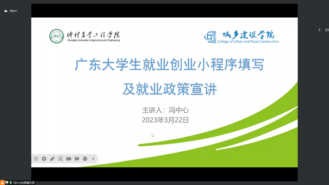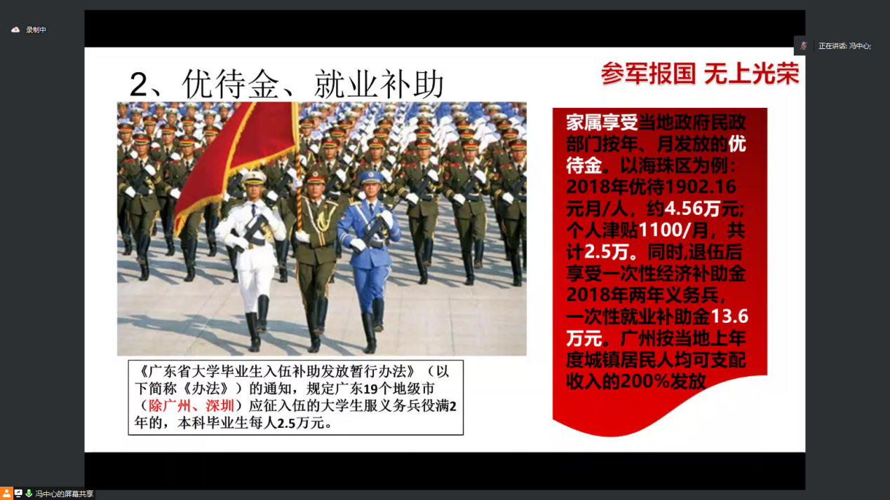 冯中心老师对广东大学生就业创业小程序填写事项进行讲解并对对国家就业政策进行宣讲,并谈到毕业生也可投身绿色军营,参军报国,或参与“三支一扶”、大学生村官、社区工作者与西部计划等。
