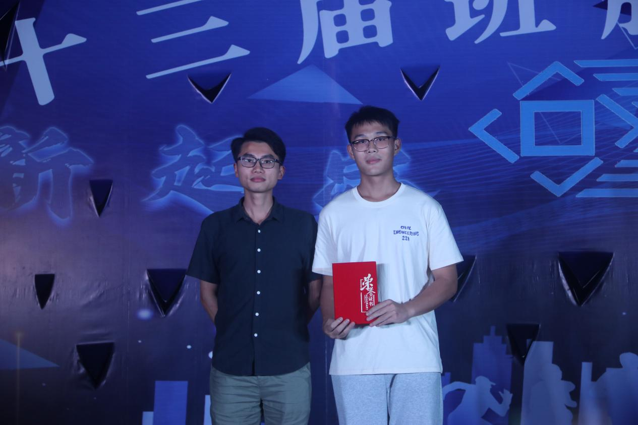 晚会最后,主持人宣布了各个奖项得主,由冯中心、刘晶、李超上台为获奖班级颁奖。土木221获得最佳设计奖,土木222获得最佳人气奖,城规222获得一等奖,土木221获得二等奖,给排221获得三等奖,给排222和土木222获得优秀奖。