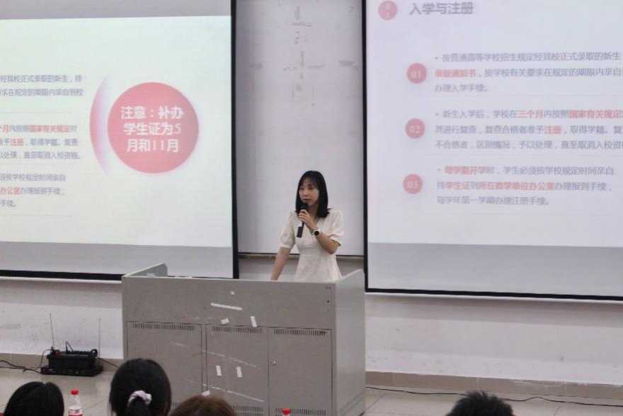 教务员李若瑜围绕本科生学分制学籍管理工作基本内容,对学校学籍管理制度、学校考试考核制度、学分绩点计算方式、本科课程等相关事项进行了详细的解读,并介绍了教务系统的操作方式以及教务网页资料、表格等查找的方式。