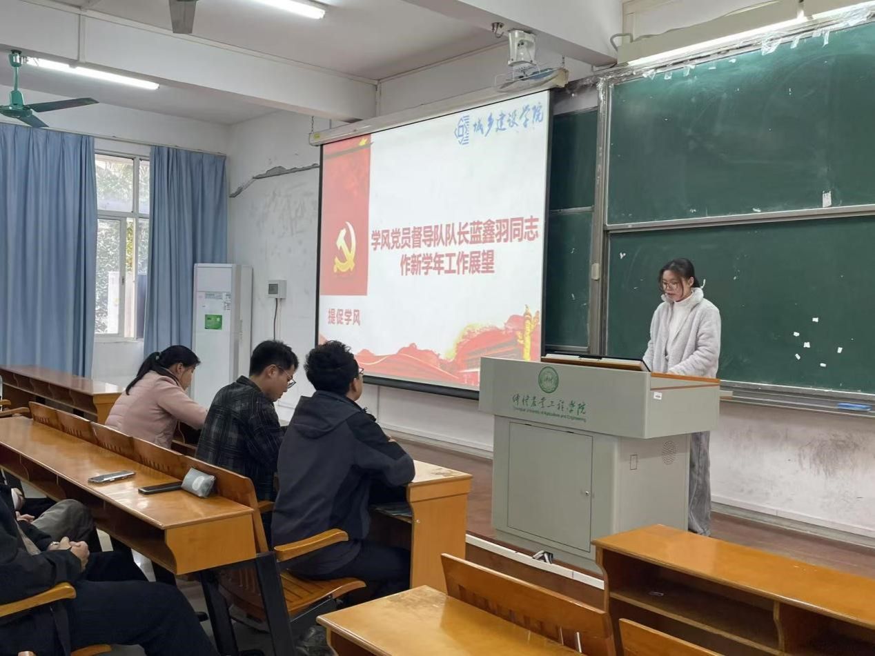 随后,新一届学风党员督导队队长蓝鑫羽上台作工作展望。她表示,新学年将重点优化查课流程与纪律监督机制,联合学生会学术部开展常态化课堂突击检查,严格落实“佩戴党员党徽、亮明身份、规范记录”的工作要求。在宿舍管理方面,督导队将加强晚熄灯、大功率电器使用等项目的巡查力度,并注重“礼貌检查、柔性督导”的工作方式。蓝鑫羽提出,将通过定期业务培训提升队员的沟通能力和应急处理水平,同时完善“查课数据当日汇总、违规情况三日复核”的信息反馈机制,确保监督工作科学化、规范化。