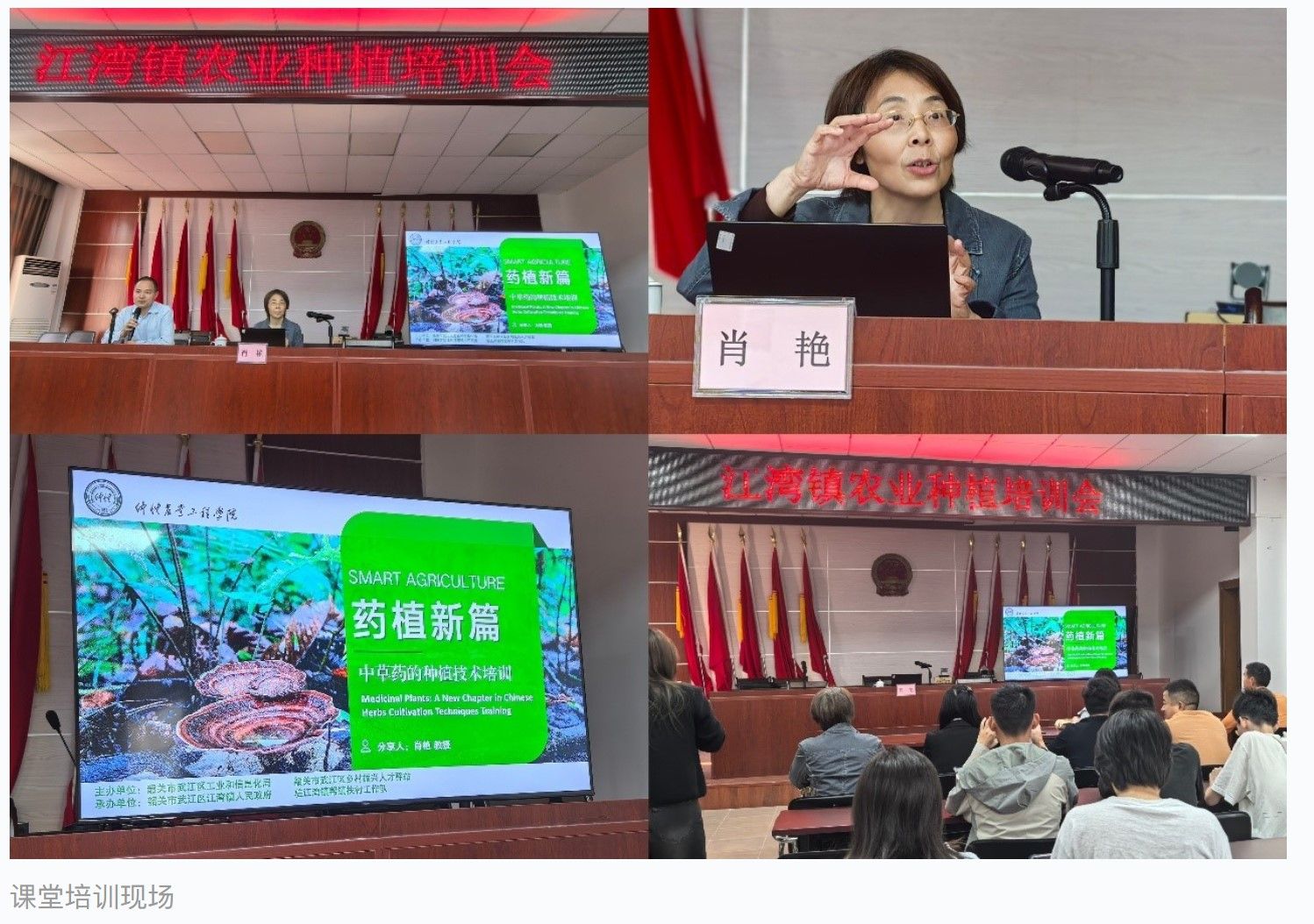 次日,“药植新篇——中草药材种植技术”培训在镇政府举行。肖艳教授从南药产业发展格局到道地药材标准化生产要点,系统讲解灵芝、天冬等特色作物的种植技术,现场解答农户疑问。与此同时,团队运用无人机航拍白石村油菜花田,梯田花海与白墙黛瓦的村落相映成趣,为文旅推广积累素材,助力农旅融合新场景打造。